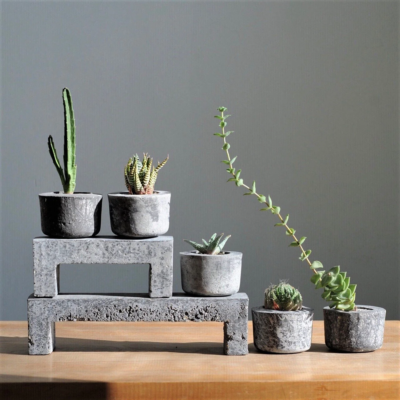 The planters, made from Portland cement, sand and organic materials, resemble the limestone rock tufa.
